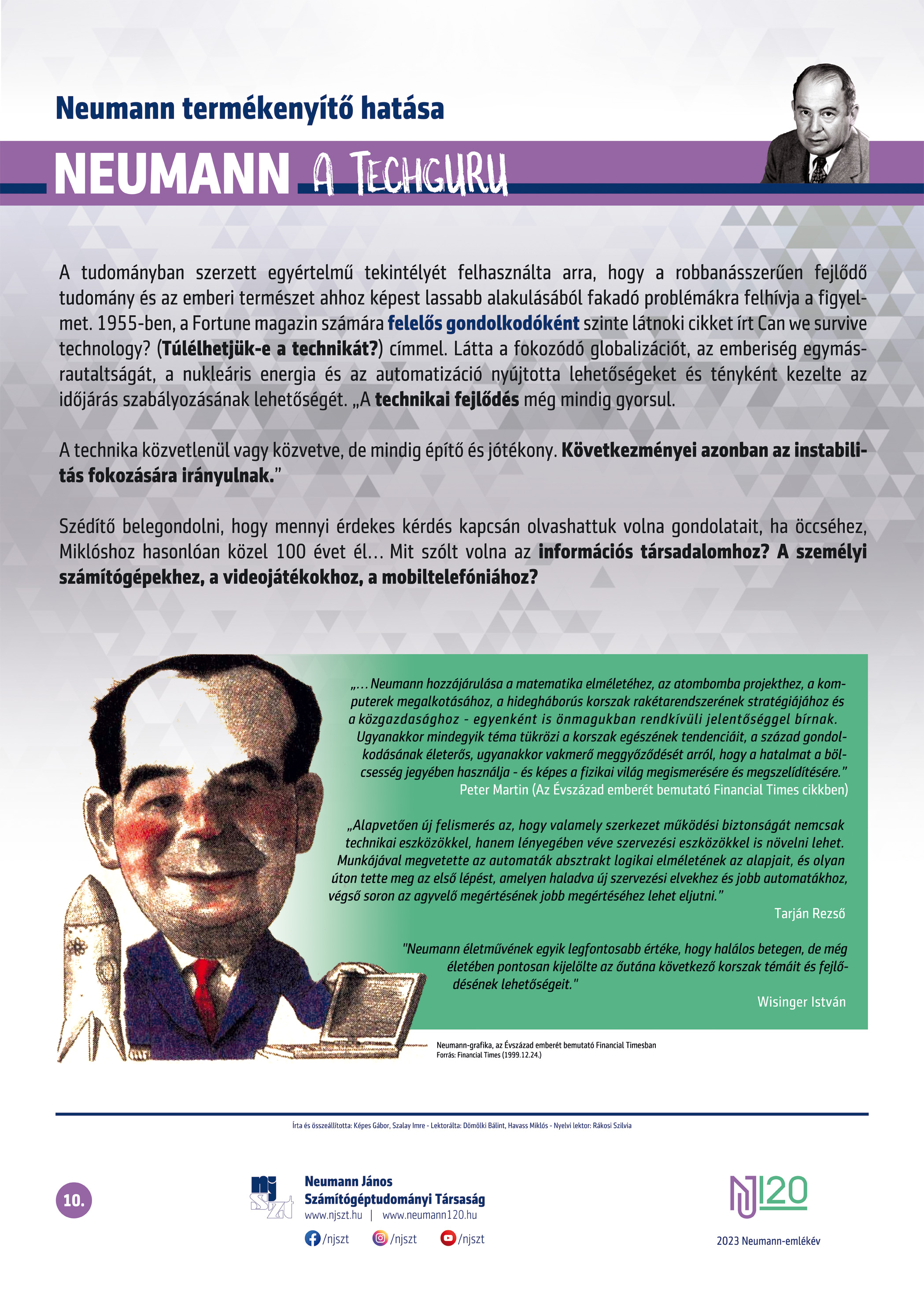 Neumann János (teljes nevén margittai Neumann János Lajos) a XX. század egyik legnagyobb matematikusa volt. Neumann János nem csak a matematikában, hanem számos más tudományban: a számítástechnika, a fizika, a közgazdaságtan, a meteorológia, az automataelmélet és nem utolsó sorban a játékelmélet terén is maradandót alkotott. Méltán mondható róla, hogy bármelyik tudományágban elért eredménye egy-egy önálló életműnek tekinthető.