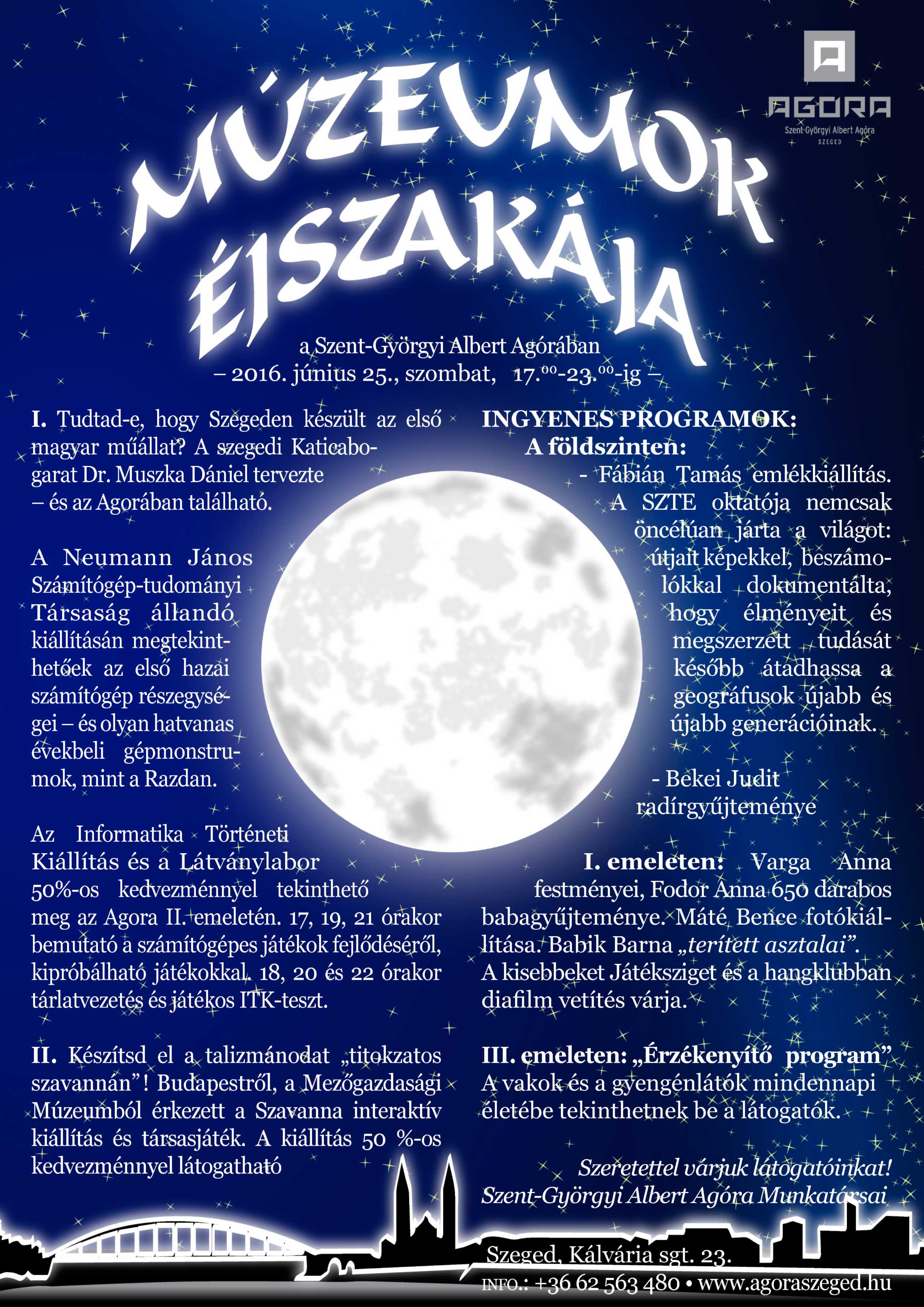 Újra itt a Múzeumok Éjszakája, június 25-én ismét izgalmas esti programok várják a múzeumbarátokat. Mi Szegedre invitáljuk az érdeklődőket. A Szent-Györgyi Albert Agora programjának keretei között Informatika Történeti Kiállításunk is nyitva tart.