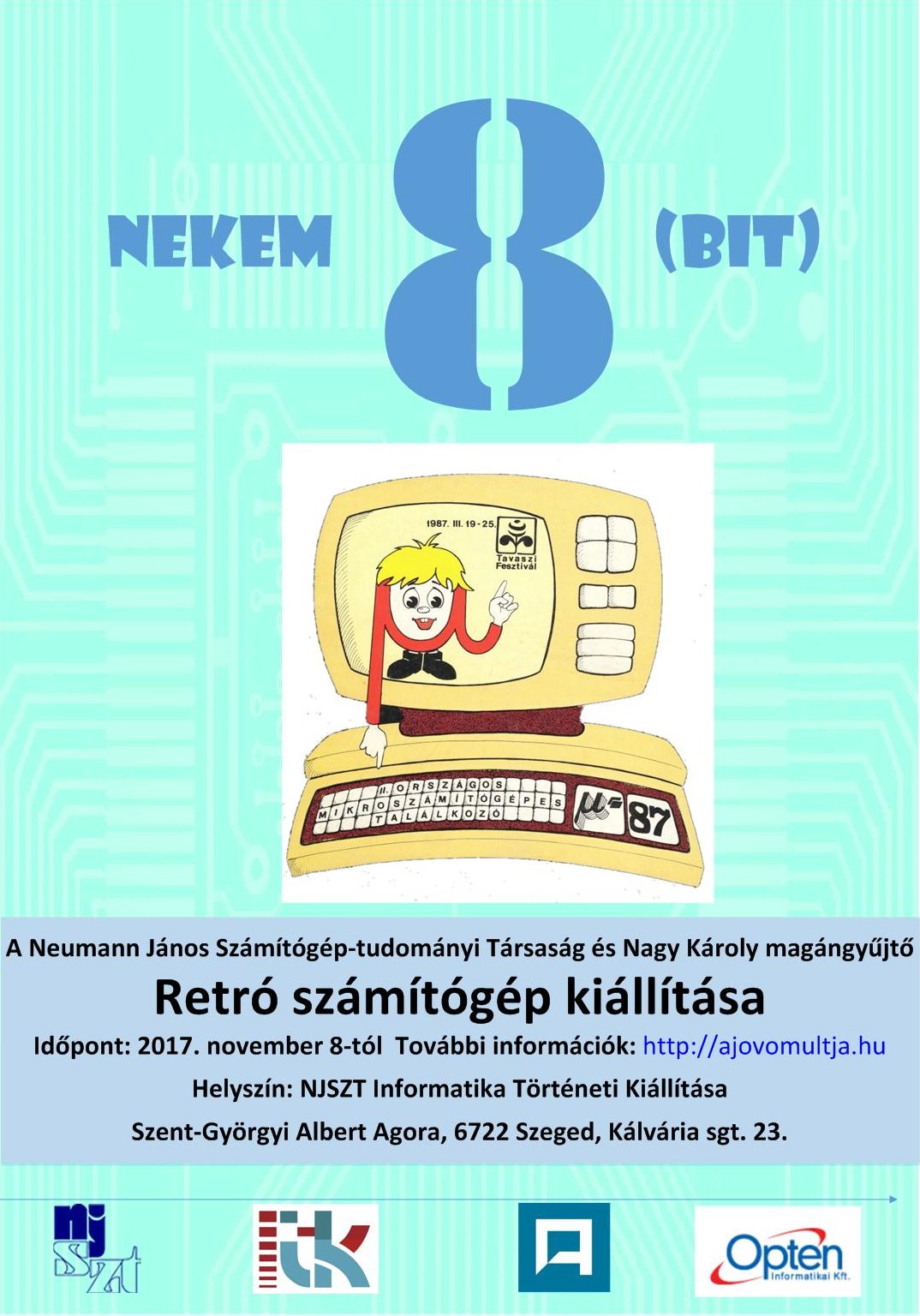 A Neumann János Számítógép-tudományi Társaság (NJSZT) és Nagy Károly magángyűjtő Budapest után új helyszínen, Szegeden, az NJSZT Informatika Történeti Kiállításának időszaki tárlataként mutatja be a Nekem 8(bit)-et.