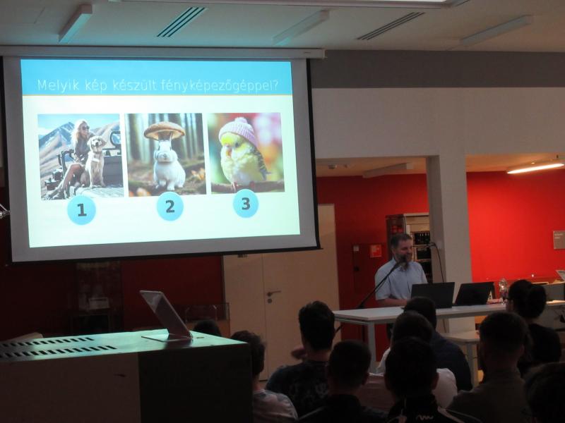 Dr. Németh Gábor, az SZTE TTIK Informatikai Intézet -Képfeldolgozás és Számítógépes Grafika Tanszékének egyetemi adjunktusa „Hogyan különböztessük meg a mesterséges intelligencia által generált képeket a fényképezőgéppel készült képektől?” c. előadásában a diákok megismerhették, hogyan működnek a napjainkban népszerű képgeneráló algoritmusok, valamint azt is megtudhatták, hogy a fényképezőgéppel készített képek kapcsán hogyan segíthet az árnyékok és fényforrások viszonya, a színszűrő rács és a szenzorzaj mintázata a digitális fényképek és a mesterséges intelligencia által generált képek megkülönböztetésében.