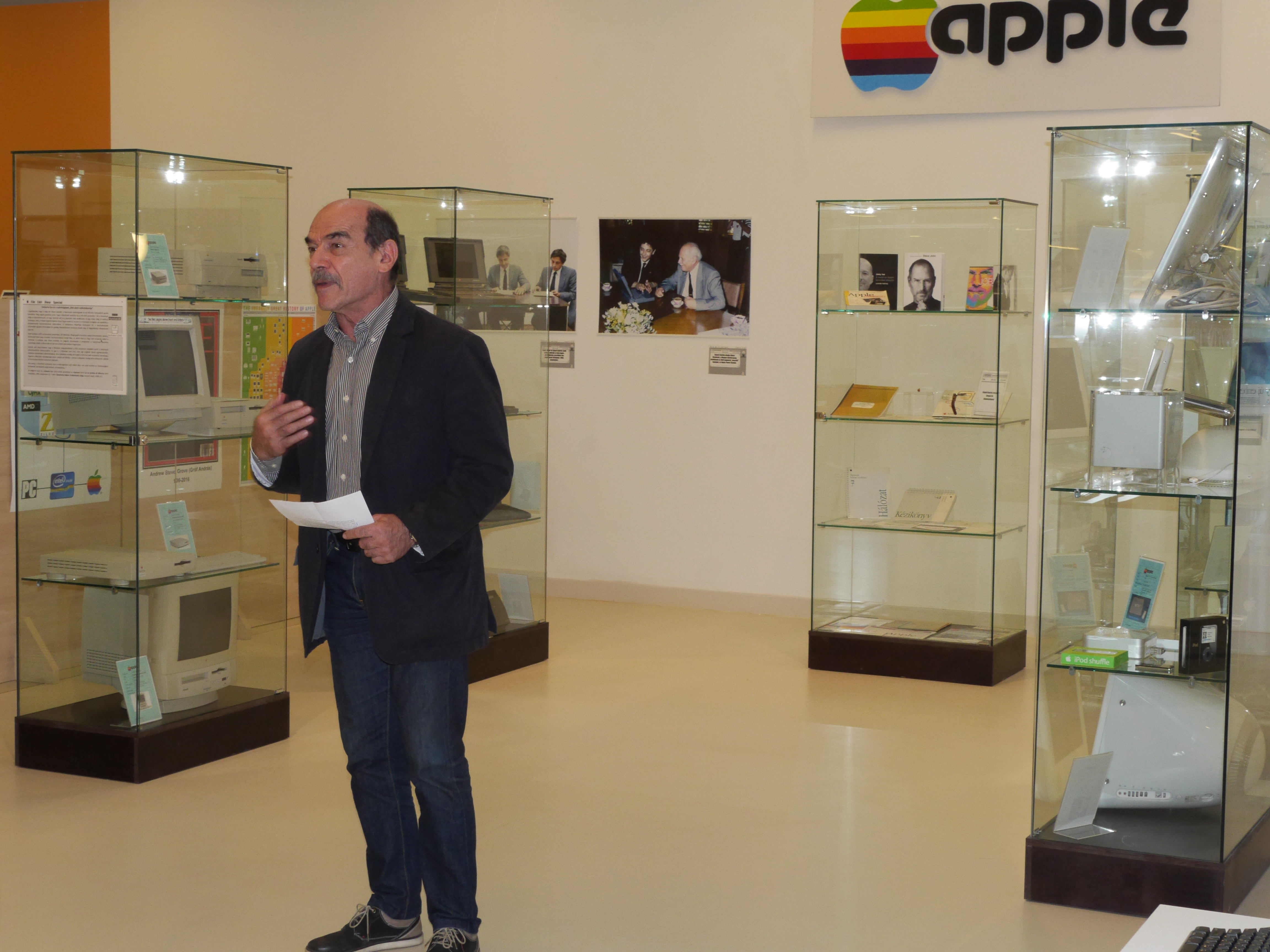A professzor a megnyitón is jelen volt – az általa felajánlott, az 1980-as évek második feléből való Apple Macintosh számítógépet nagyobb hátizsákra emlékeztető hordtáskájával együtt láthatjuk a vitrinben.