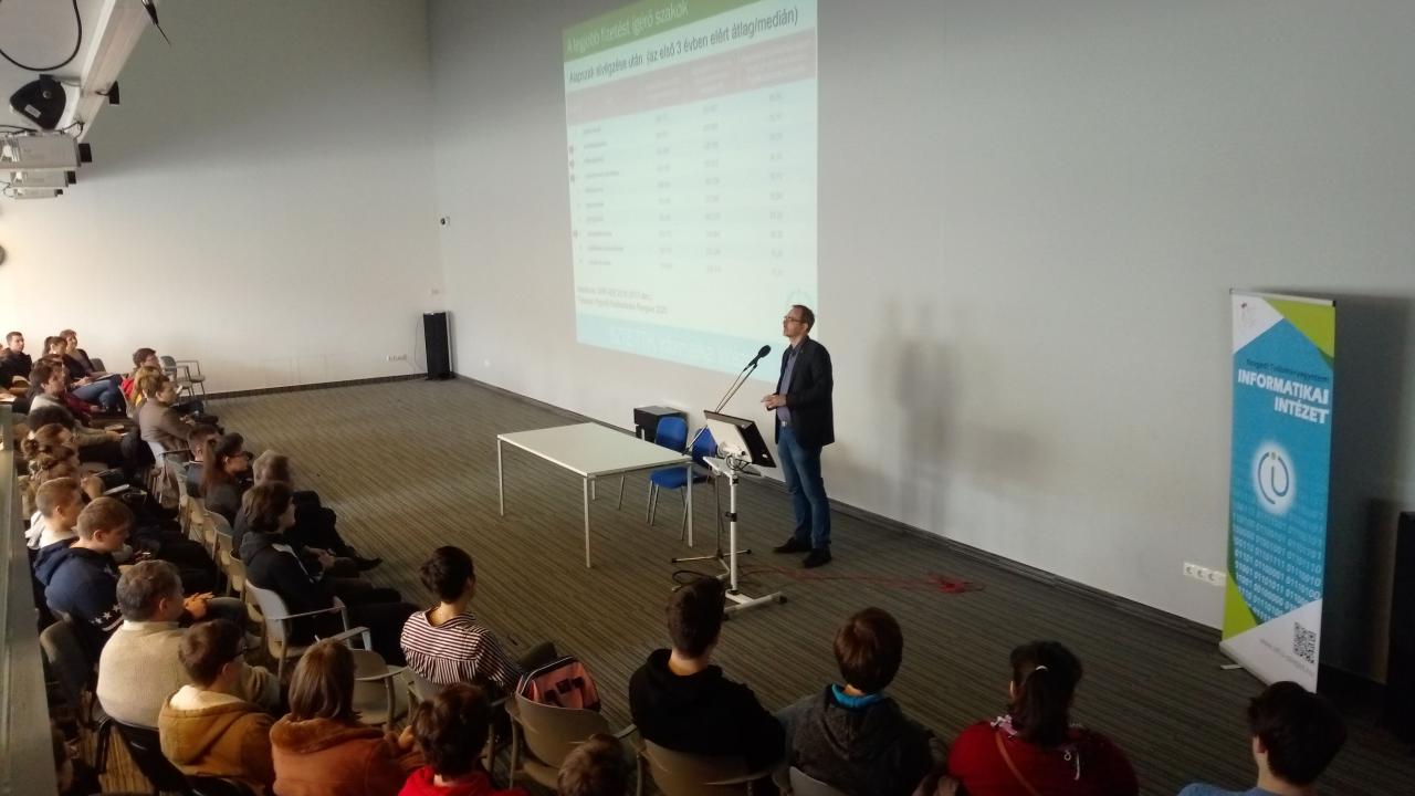 A nyílt nap kezdetekor Dr. Nyúl László, az intézet vezetője tartott előadást a leendő informatikusoknak, hogy mire számíthatnak és milyen lehetőségeket nyújt számukra az informatika. Hatalmas érdeklődéssel jelentek meg a továbbtanulni készülő diákok.