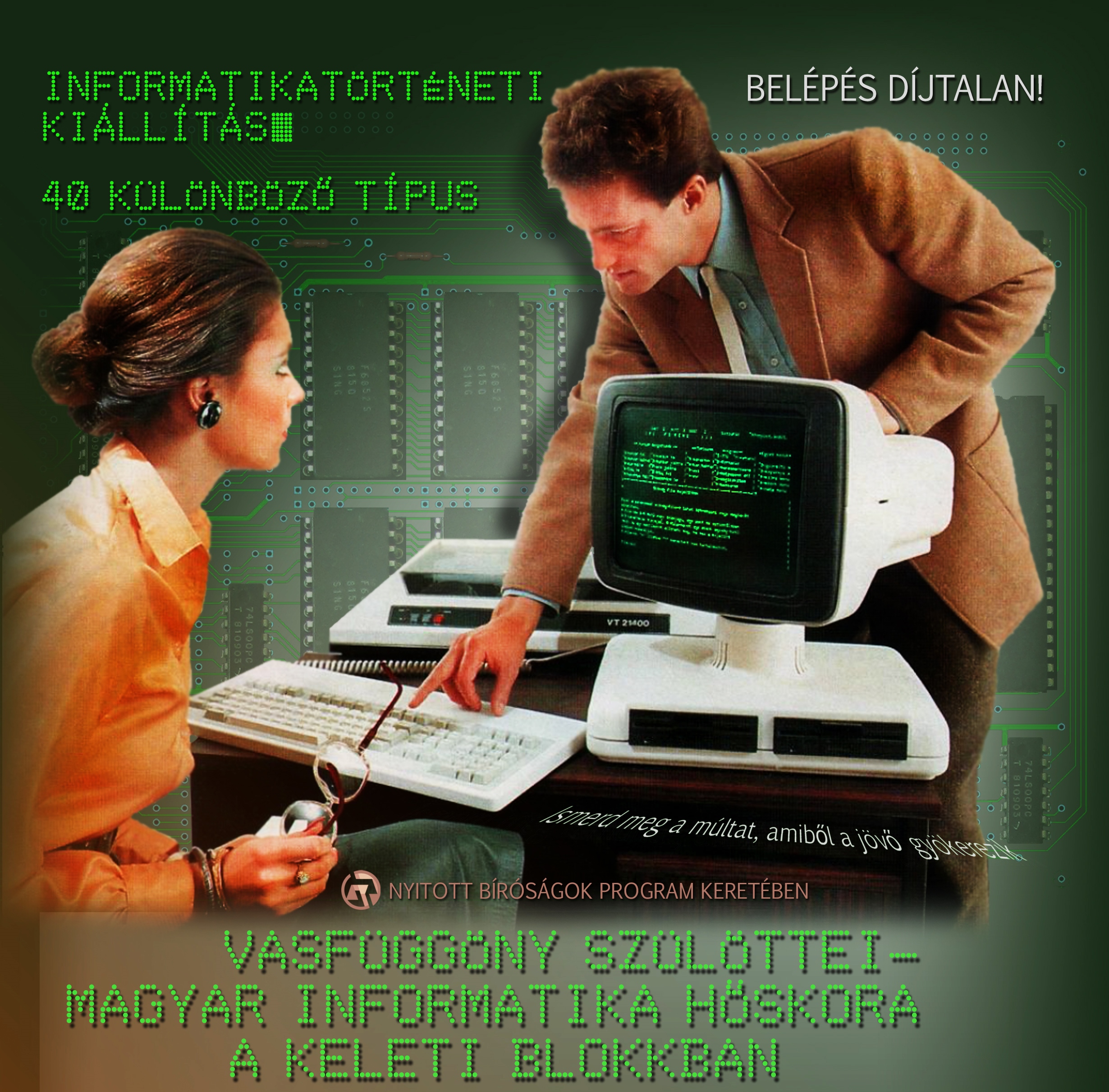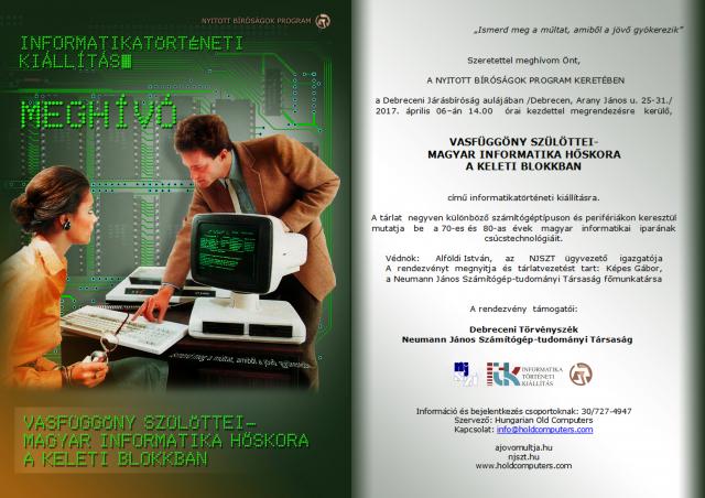 A Neumann János Számítógép-tudományi Társaság (NJSZT) szakmai támogatásával mutatja be magángyűjteménye legérdekesebb darabjait Vidovenyecz Zsolt debreceni magángyűjtő. Az április 6-án, 14 órakor nyíló kiállítást a Nyitott Bíróságok program keretében, a Debreceni Járásbíróság aulájában lehet megtekinteni. A tárlat negyven különböző számítógéptípuson és perifériákon keresztül mutatja be a 70-es, 80-as évek magyar informatikai iparának csúcstechnológiáit, a legkorábbi darabok pedig a hatvanas évekbe kalauzolják vissza a látogatót.
